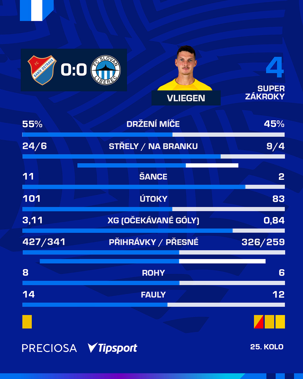 O tom, jak mimořádný Vliegenův výkon byl, svědčí také statistika počtu očekávaných branek. Baník měl vstřelit podle metriky xG 3,11 gólu, Slovan pak 0,84. Domácí vyhráli na střely na bránu 6:4, liberecké vápno zasypali celkem 101 útoky, z nichž bylo 21 zakončeno. Oběma celkům častokrát chyběla přesnost v zakončení.