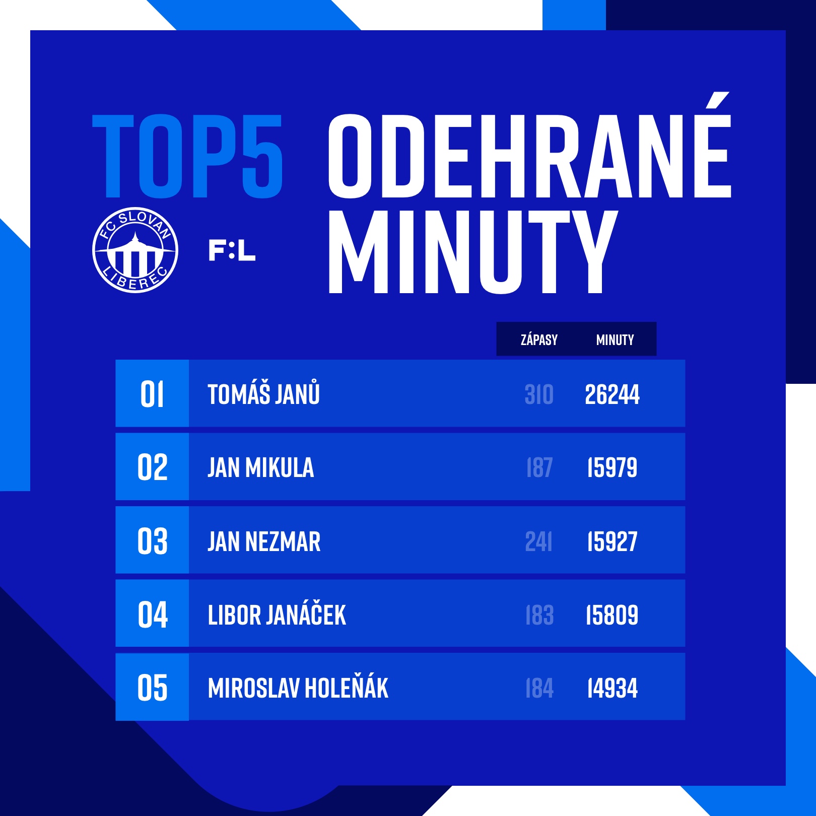 Druhým hráčem, který zaznamenal významný milník, je zkušený Jan Mikula, jenž byl v minulých sezonách zvolen i kapitánem a pásku na roce nosí často i v této sezoně. U Nisy absolvuje již svoji osmou ligovou sezonu a počtem odehraných minut se řadí mezi legendy Slovanu. Tím, že v utkání proti Českým Budějovicím odehrál devadesát minut, totiž předběhl Jana Nezmara a s 15 979 minutami se zařadil v historické tabulce našeho klubu za Tomáše Janů na druhé místo. „O tom jsem ani nevěděl. Každopádně to pro mě je čest, že jsem se v historických statistikách dostal takhle vysoko a odehrál tolik minut v lize, obzvlášť tady v Liberci. Jsem za to opravdu rád,“ komentuje to fotbalista, který už, včetně minut odehraných ve Slavii a v Jihlavě, překonal i metu 20 000 ligových minut.