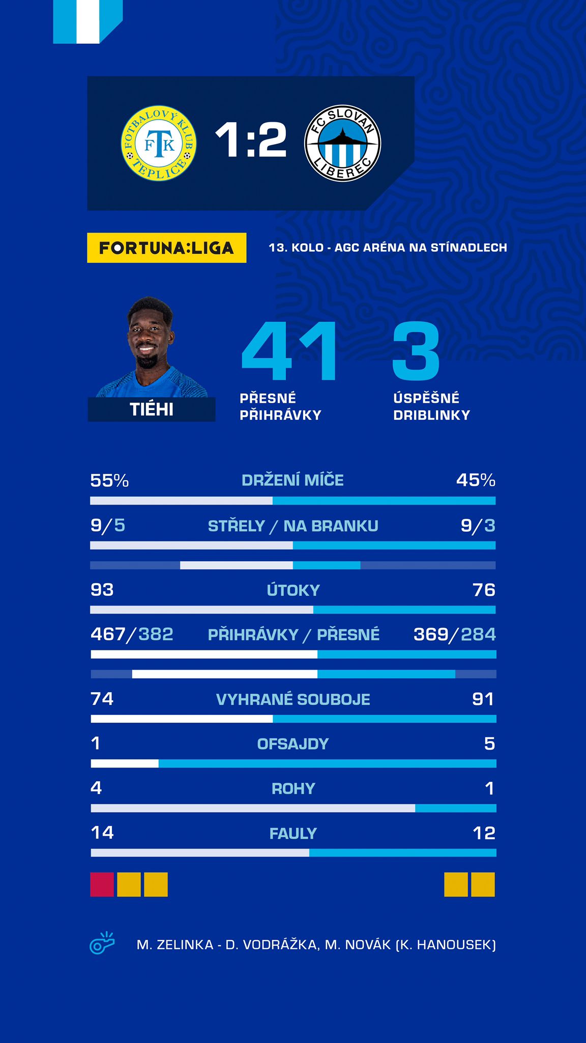 V čem byl zásadní rozdíl mezi oběma celky? V soubojích. Slovan se dokázal na fyzicky náročné utkání připravit dobře, soupeře v osobních střetech porážel. Na hřišti se celkem odehrálo 165 bitev o míč, naše mužstvo jich vyhrálo 91 (55 %), Teplice se dostaly na 74 vybojovaných balonů. Vůbec nejúspěšnější byl Christ Tiéhi, jenž prohrál jediný z osmi podstoupených soubojů.