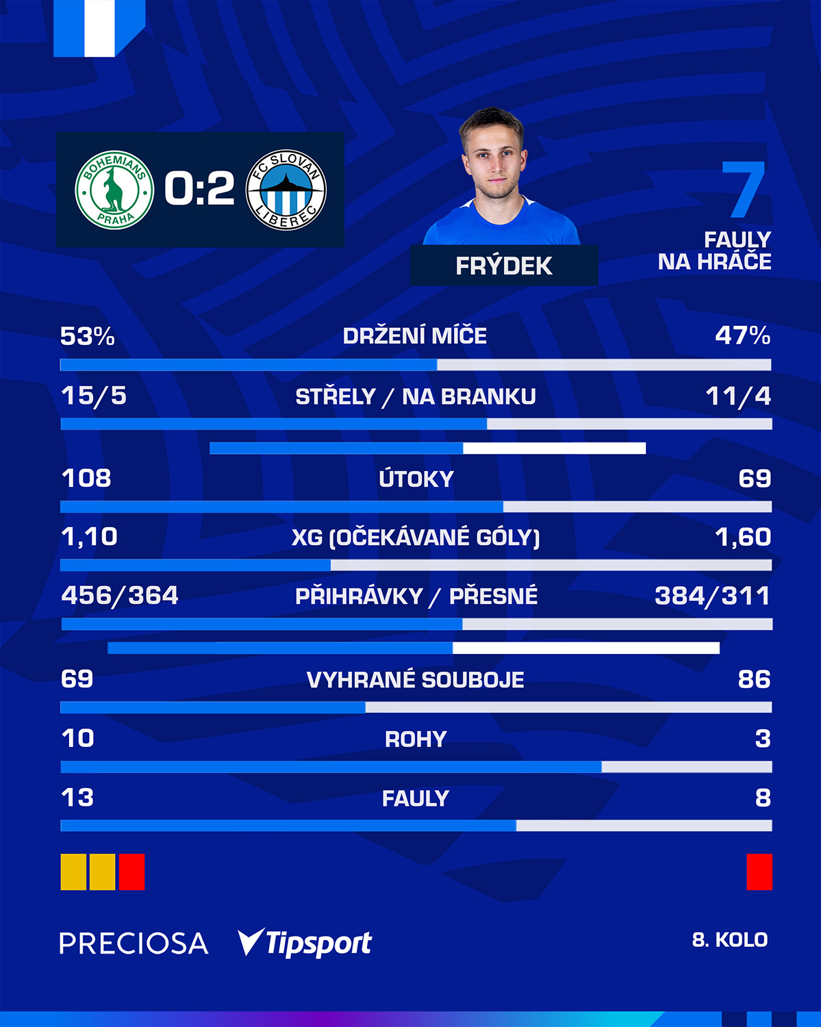 Oba celky držely balon průměrně 13 sekund, častěji faulovali domácí, a to v poměru 13:8. Slovan i Bohemians si vytvořily čtyři šance, prosadili se pouze modrobílí. Slovan dominoval v soubojích, který vyhrál 55 % (86 ku 69). Další zápas čeká naše mužstvo už v sobotu, kdy přivítá Mladou Boleslav. K Nise se vrátí bývalý trenér Pavel Hoftych, který vede soupeře. Přijďte naše mužstvo podpořit, začíná se v 16 hodin.